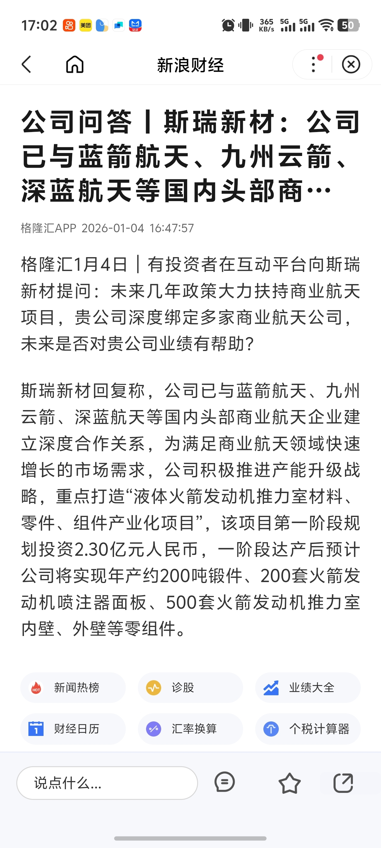 $斯瑞新材(SH688102)$ 商业航天独供+蓝箭股权绑定+核聚变。蓝箭航天推力室内壁独家供应商,战略投资蓝箭,受益其IPO与火箭量产化,可回收趋势。与九州云箭、深蓝航天等深度绑定,订单确定性强。对比同样持有蓝箭股权$金风科技(SZ002202)$ 和 $鲁信创投(SH600783)$ ,斯瑞新材不仅股权投资,还有和蓝箭,九州云箭深度合作。