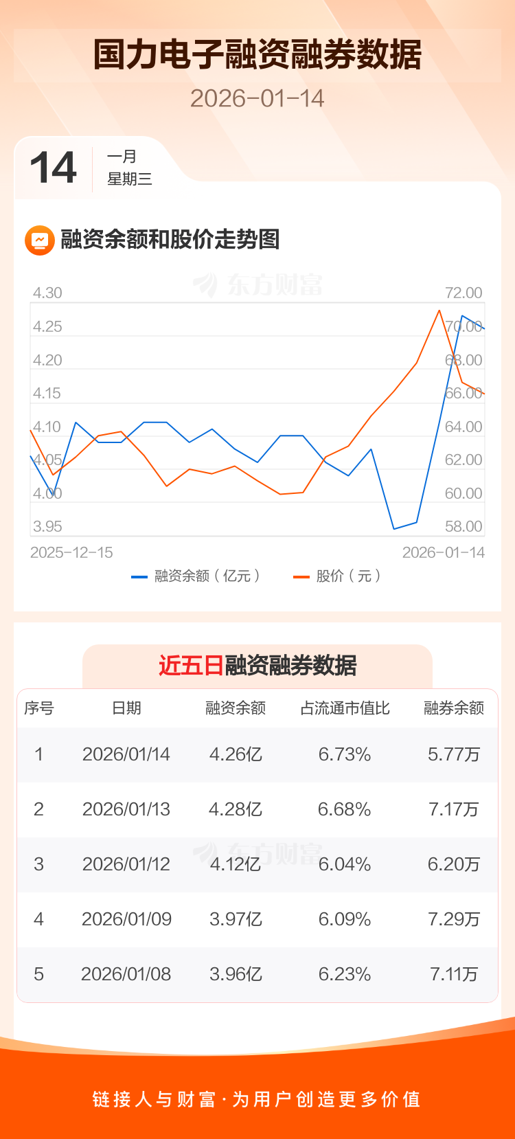 交易所最新数据显示,国力电子于2026年1月14日获融资买入2049.90万元,融资偿还2204.86万元,当日融资净偿还154.96万元。目前,该股融资余额4.26亿,占流通市值比例为6.73%。