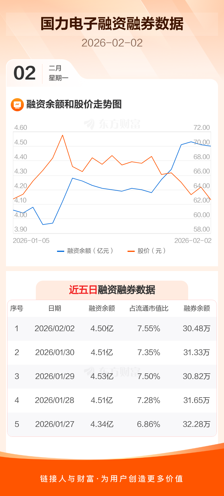交易所最新数据显示,国力电子于2026年2月2日获融资买入1227.21万元,融资偿还1301.01万元,当日融资净偿还73.8万元。目前,该股融资余额4.50亿,占流通市值比例为7.55%。