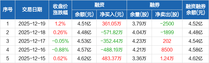 金宏气体:融资净买入361.05万元,融资余额4.51亿元(12-19)