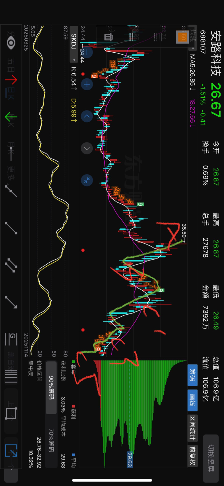 $安路科技(SH688107)$ 跌的真墨迹 ,我感觉还有一种可能性,不跌破24.44 走一个C子浪 然后大反包突破上去!KDJ 参数看已经底部了,我36日kd 长周期 见底了 !