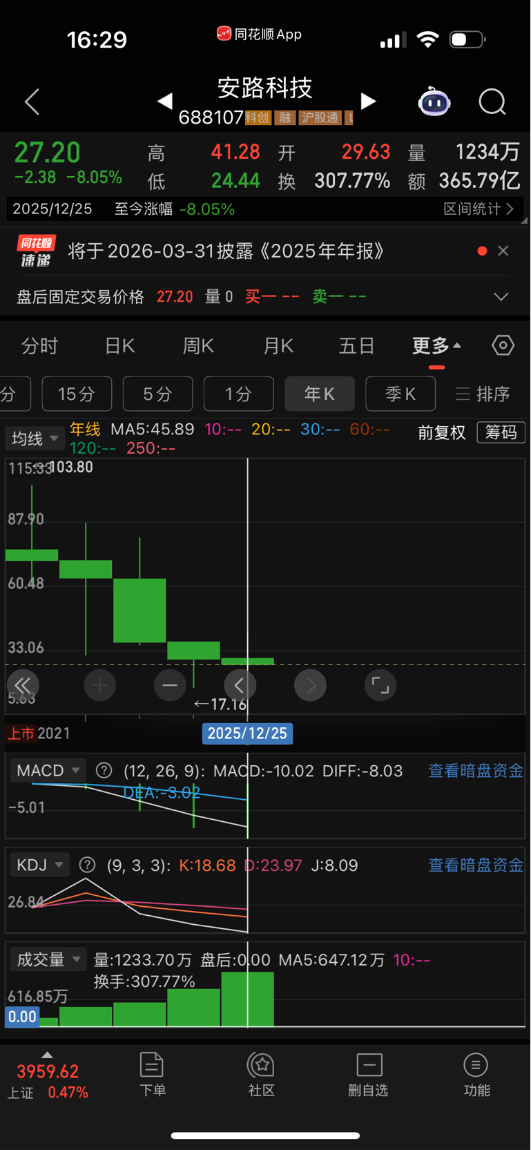 2021年上市以来即将连续五年收阴线,2025年还有4个交易日年线收官需要涨8.