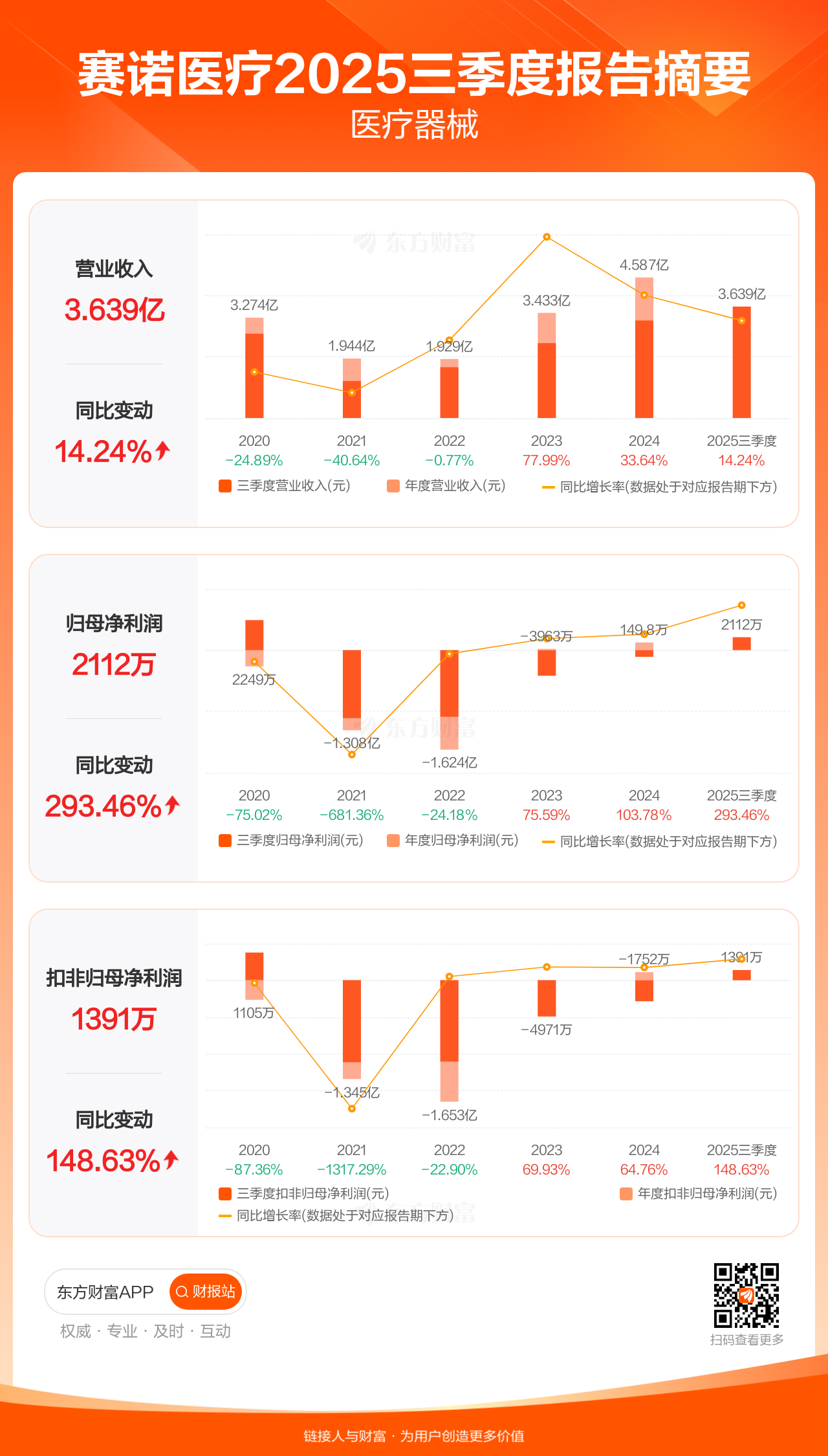 赛诺医疗10月31日发布2025年三季报显示,公司前三季实现营业收入3.64亿元,同比增长14.24%;归母净利润2111.80万元,同比增长293.46%;扣非归母净利润1390.59万元,同比增长148.63%。