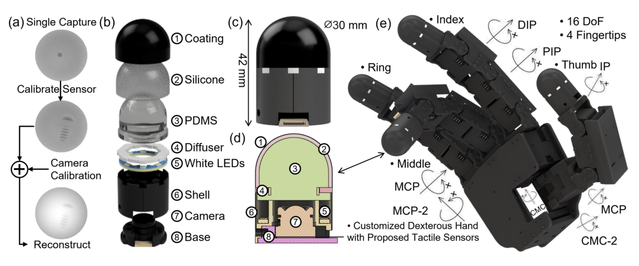 (高精度触觉传感:利用光度立体原理,通过编码器-解码器神经网络和泊松求解器重建接触面几何形状,实现高保真表面几何图形的重建)