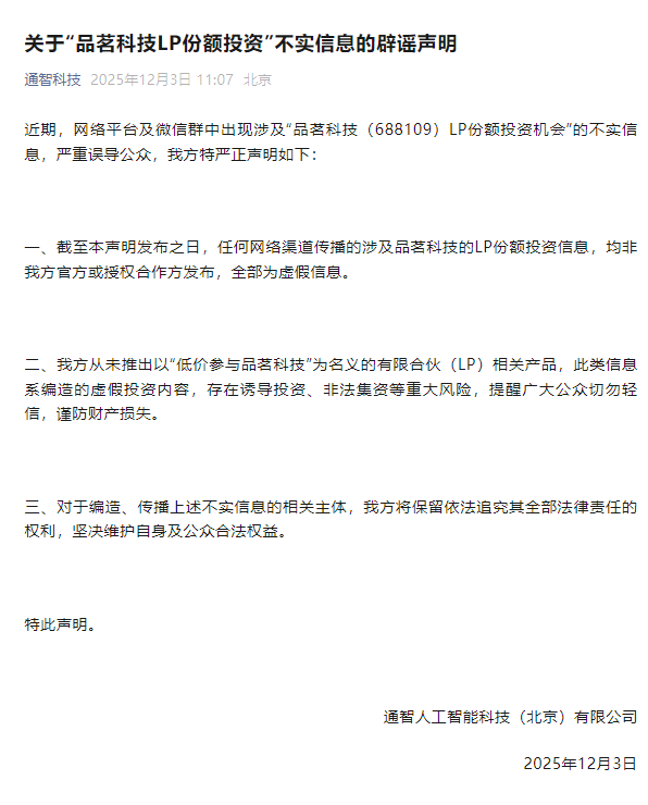 12月3日,通智科技严正声明,称从未推出以“低价参与品茗科技”为名义的有限合伙(LP)相关产品,此类信息系编造的虚假投资内容,存在诱导投资、非法集资等重大风险,提醒广大公众切勿轻信,谨防财产损失。通智科技强调,截至本声明发布之日,任何网络渠道传播的涉及品茗科技的LP份额投资信息,均非通智科技官方或授权合作方发布,全部为虚假信息。