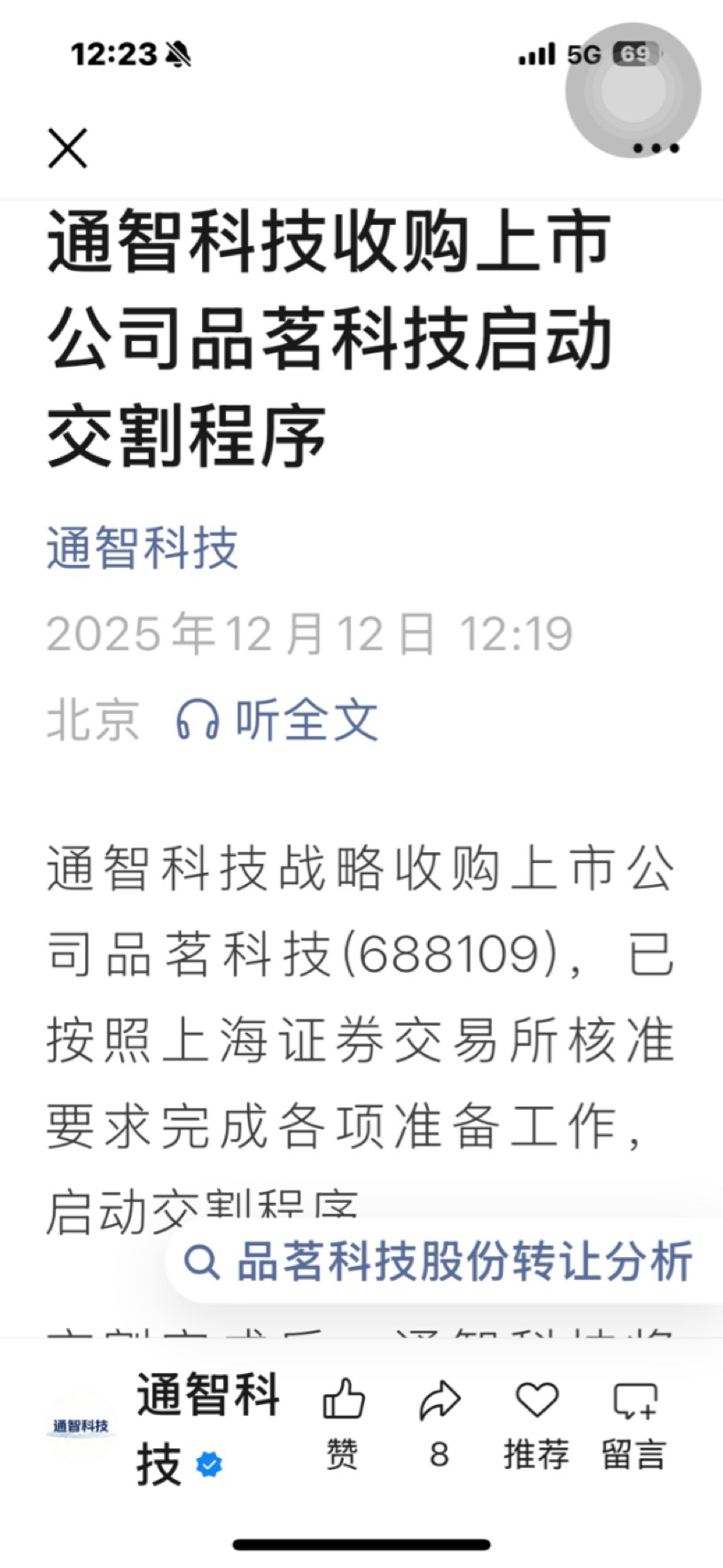 通智科技战略收购上市公司品茗科技(688109),已按照上海证券交易所核准要求完成各项准备工作,启动交割程序。