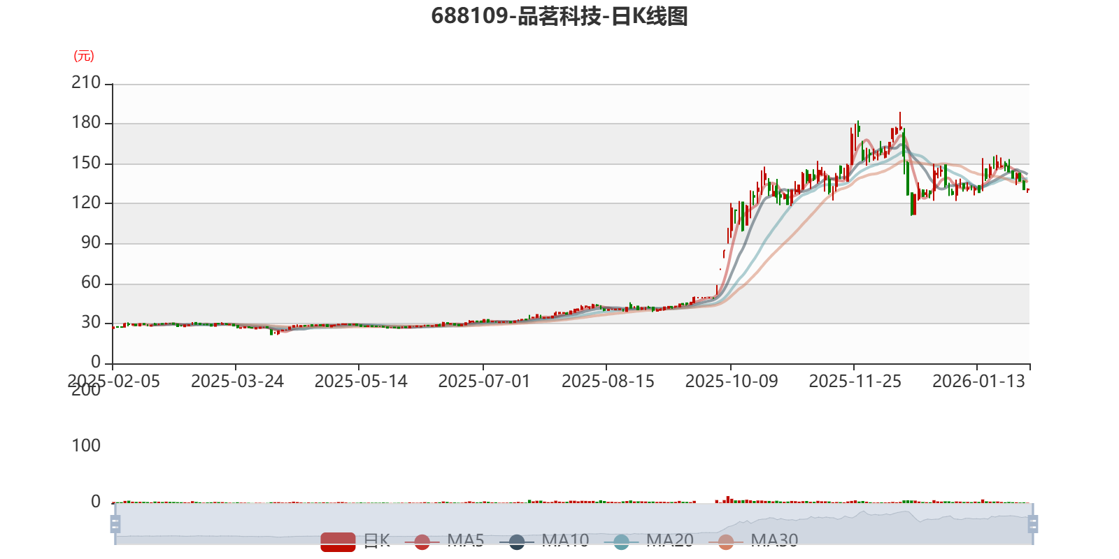 中证智能财讯品茗科技(688109)1月30日晚间披露2025年度业绩预告,预计2025年实现营业收入4.2亿元至4.5亿元;归母净利润4600万元至5000万元,同比增长46.13%-58.83%;扣非净利润预计3440万元至3840万元,同比增长63.6%-82.62%。以1月30日收盘价计算,品茗科技目前市盈率(TTM)约为206.25倍-224.19倍,市净率(LF)约12.96倍,市销率(TTM)约23.71倍。