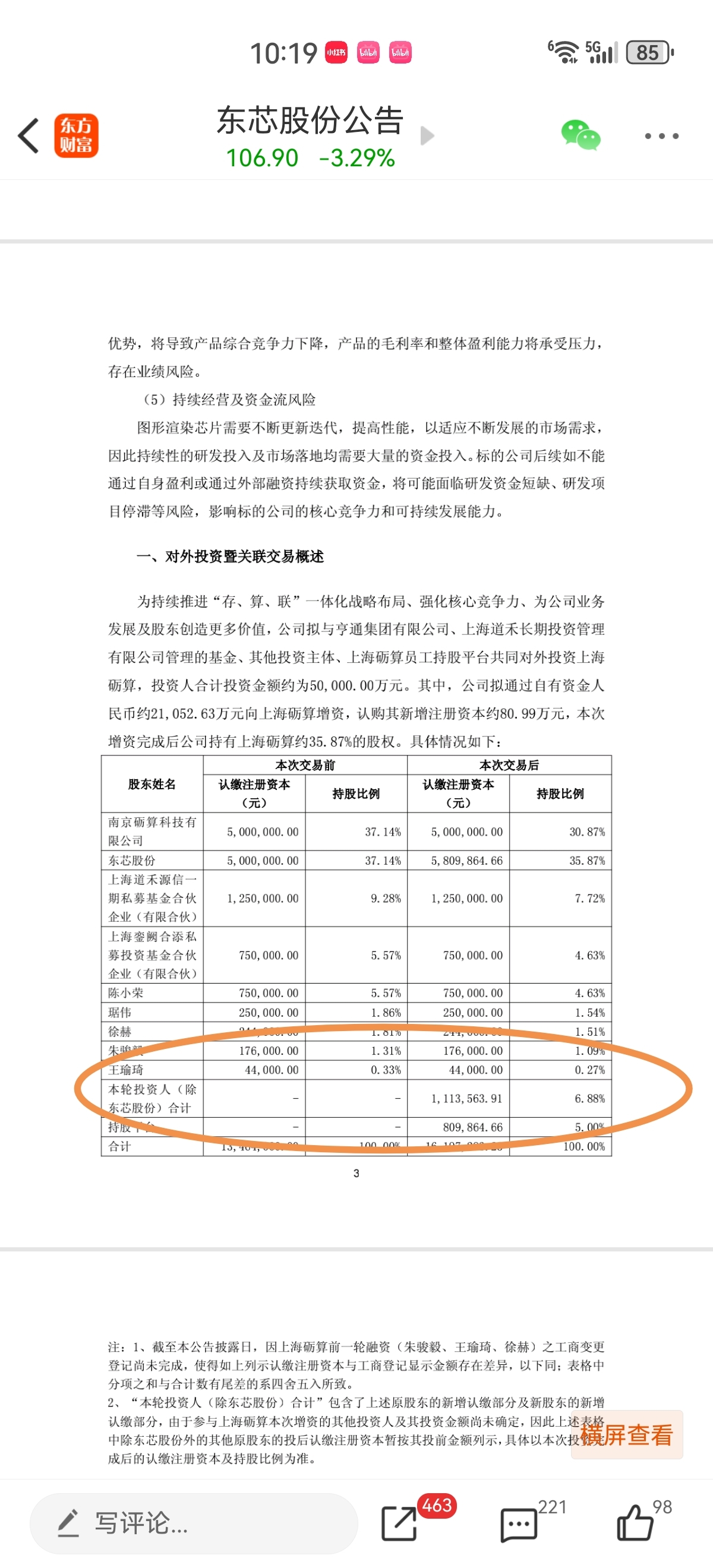这份合同现在签,其实就是哪6.8%的待定股东。从发这张图的人的文案看。这里面还有国家队。还有赵建平。赵建平在二级市场上买成了东芯的大股东,现在又在一级市场去跟投砺算科技。。