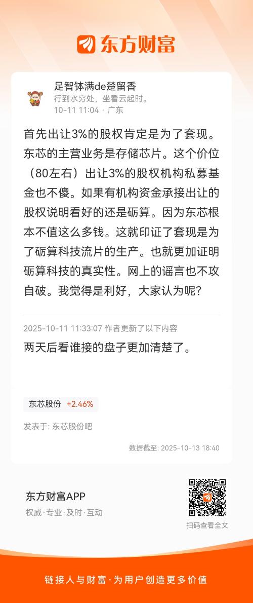 首先出让3%的股权肯定是为了套现。东芯的主营业务是存储芯片。这个价位(80左右)出让3%的股权机构私募基金也不傻。如果有机构资金承接出让的股权说明看好的还是砺算。因为东芯根本不值这么多钱。这就印证了套现是为了砺算科技流片的生产。也就更加证明砺算科技的真实性。网上的谣言也不攻自破。我觉得是利好,大家认为呢?