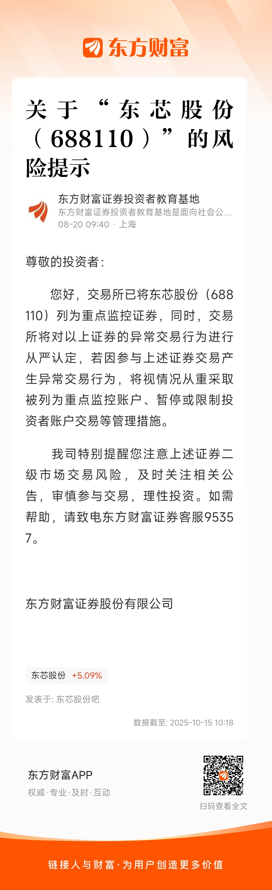 我司特别提醒您注意上述证券二级市场交易风险,及时关注相关公告,审慎参与交易,理性投资。如需帮助,请致电东方财富证券客服95357。