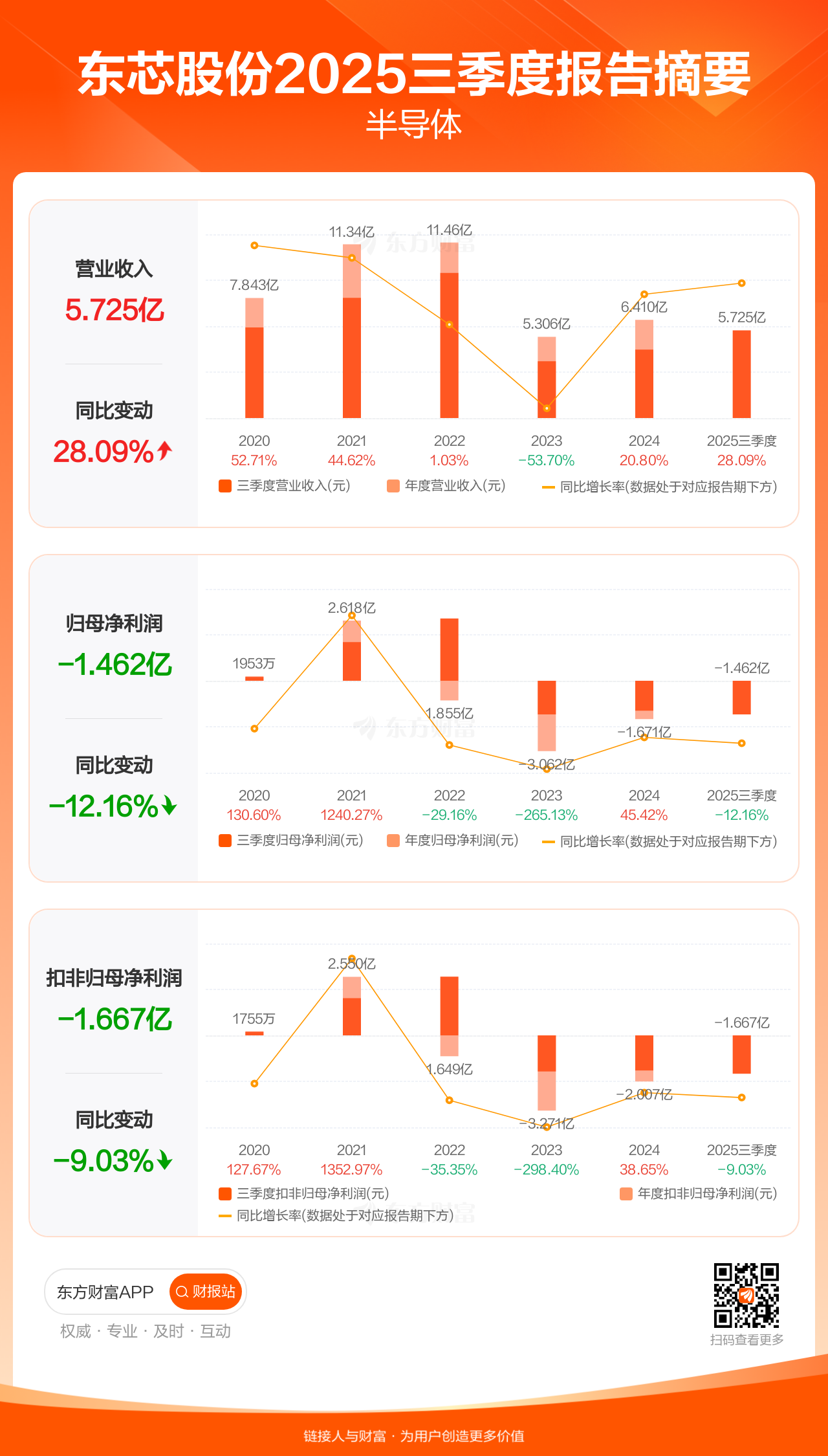 东芯股份10月29日发布2025年三季报显示,公司前三季实现营业收入5.73亿元,同比增长28.09%;归母净利润-1.46亿元;扣非归母净利润-1.67亿元。