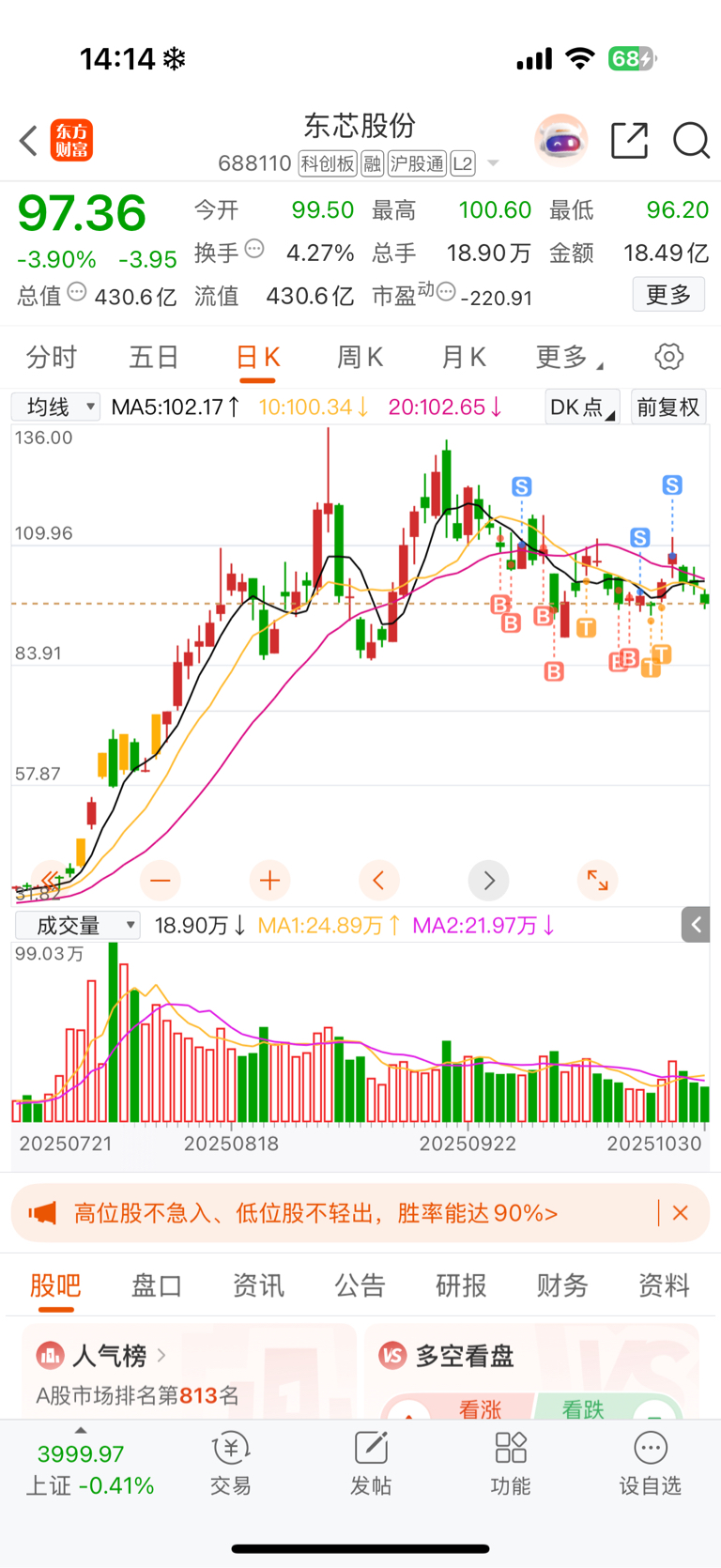 $东芯股份(SH688110)$ 管住手了,昨天100差点买