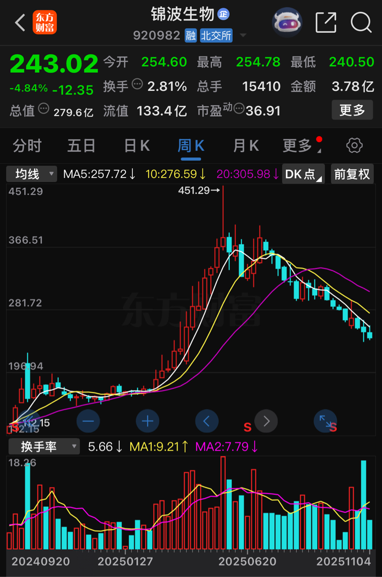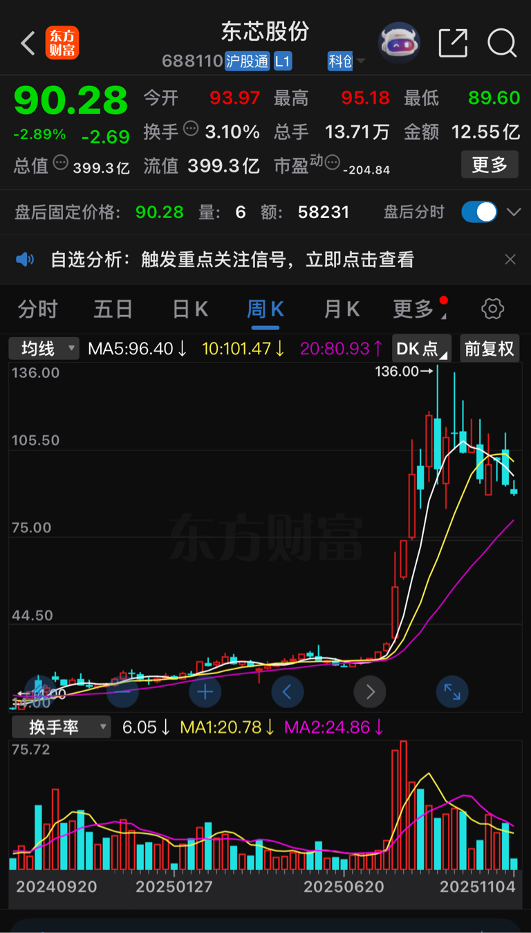 $东芯股份(SH688110)$ 参照锦波生物,都是股权激励,都是减持,一路下跌,从370元跌回钟首富接盘价240元。东芯连年亏损,比锦波生物(市值280亿)更差,东芯市值竟然有400亿,预计本月目标85元。看看周线,一目了然!