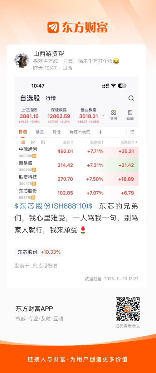 温馨提示: 1.根据《证券法》规定,禁止编造、传播虚假信息或者误导性信息,扰乱证券市场;2.用户在本社区发表的所有资料、言论等仅代表个人观点,与本网站立场无关,不对您构成任何投资建议。用户应基于自己的独立判断,自行决定证券投资并承担相应风险。《东方财富社区管理规定》