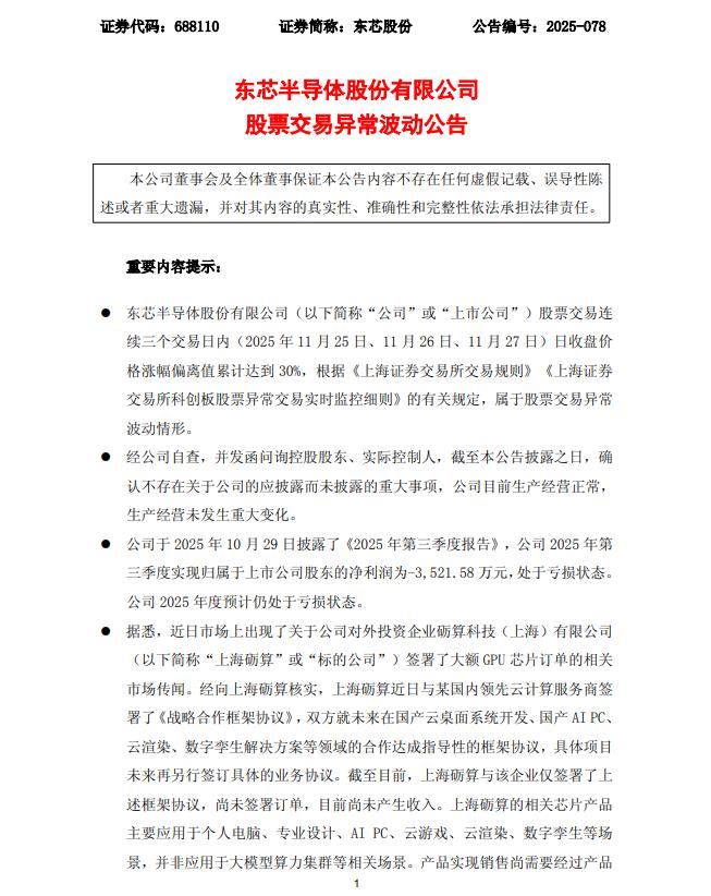 东芯股份:上海砺算近日与某国内领先云计算服务商签署了《战略合作框架协议》