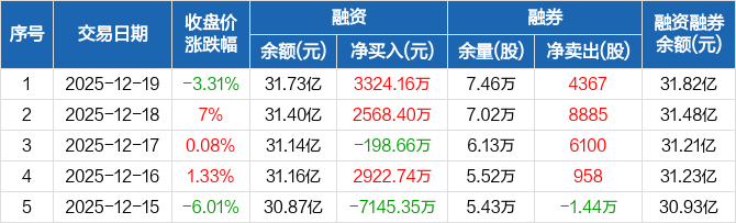 融资方面,当日融资买入2.38亿元,融资偿还2.05亿元,融资净买入3324.16万元。融券方面,融券卖出5867股,融券偿还1500股,融券余量7.46万股,融券余额864.97万元。融资融券余额合计31.82亿元。