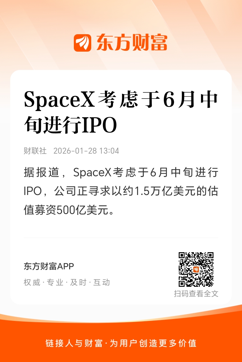 据报道,SpaceX考虑于6月中旬进行IPO,公司正寻求以约1.5万亿美元的估值募资500亿美元。