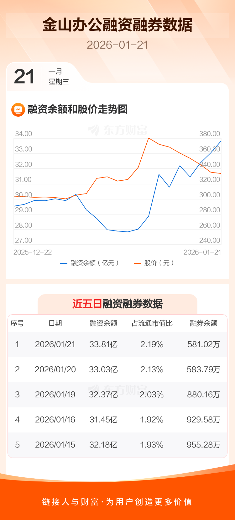 交易所最新数据显示,金山办公于2026年1月21日获融资买入2.57亿元,融资偿还1.79亿元,当日融资净买入7718.58万元。目前,该股融资余额33.81亿,占流通市值比例为2.19%。