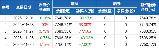联测科技:融资净偿还96.97万元,融资余额7649.78万元(12-01)