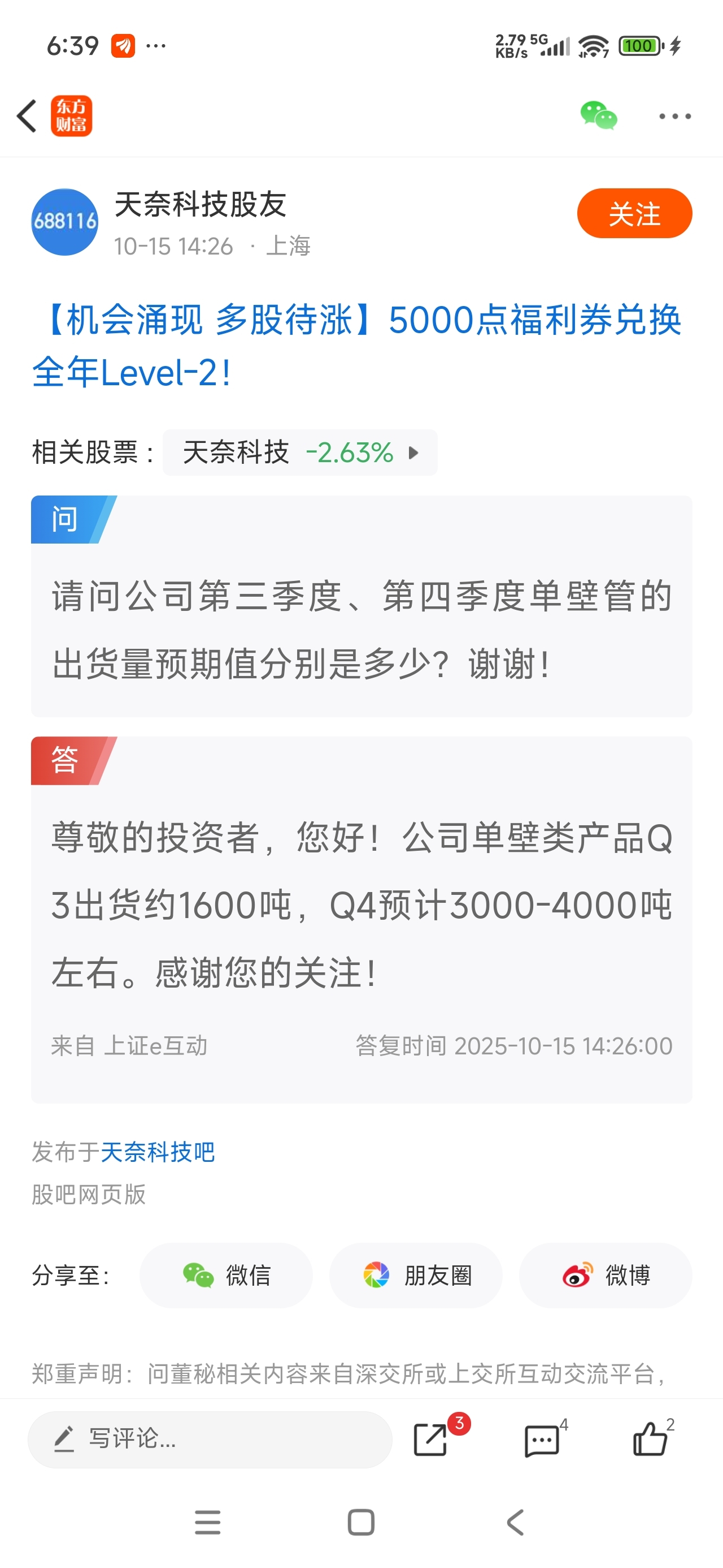 $天奈科技(SH688116)$ 三季度是0.22元,公司公告四季度比三季度翻番以上就是0.44元到0.5元,三季报是0.55元,那么年报业绩在0.99元到1.1元。2026年130吨到140吨产能是今年40吨三倍,理论上推演业绩在3.3元以上。单壁碳纳米管到2027都是供不应求所以价格应该是稳步上升,推演数据也是保守的!