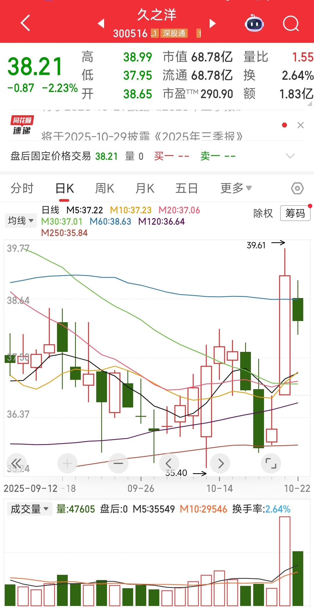 久之洋从35.40元低位反弹,涨到前期压力位(38-39元区间)时,出现“大阳线+十字星”组合: