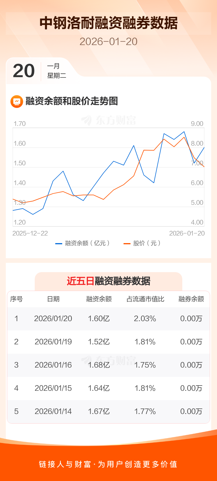 交易所最新数据显示,中钢洛耐于2026年1月20日获融资买入4633.70万元,融资偿还3837.93万元,当日融资净买入795.78万元。目前,该股融资余额1.60亿,占流通市值比例为2.03%。