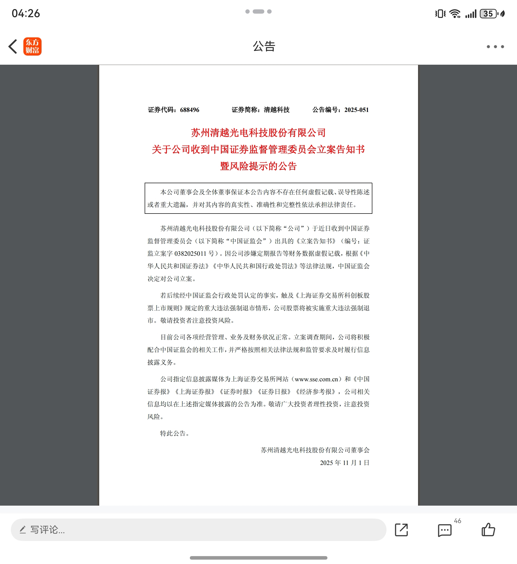 $卓然股份(SH688121)$ 清越科技是财务造假有退市风险也才一个跌停板!卓然股份没有造假,只是立案调查违规使用募集资金问题!公告内容都不一样!预计卓然可能一个跌停板都没有!