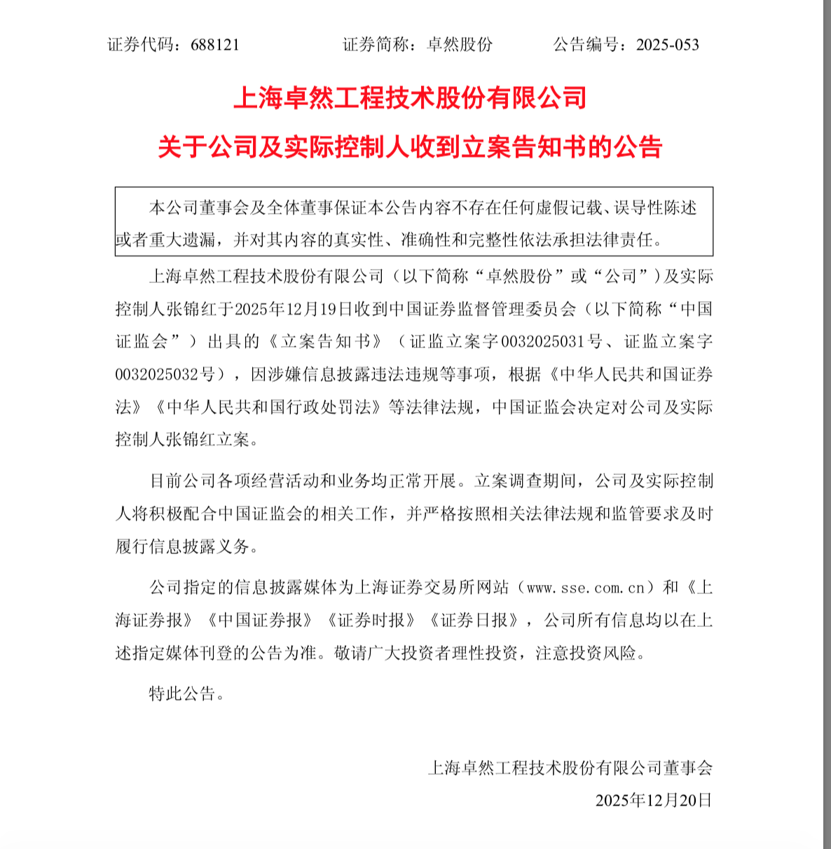 2025年12月20日,卓然股份公告收到证监会下发的《立案告知书》,因公司涉嫌信息披露违法违规,证监会决定对公司立案调查。
