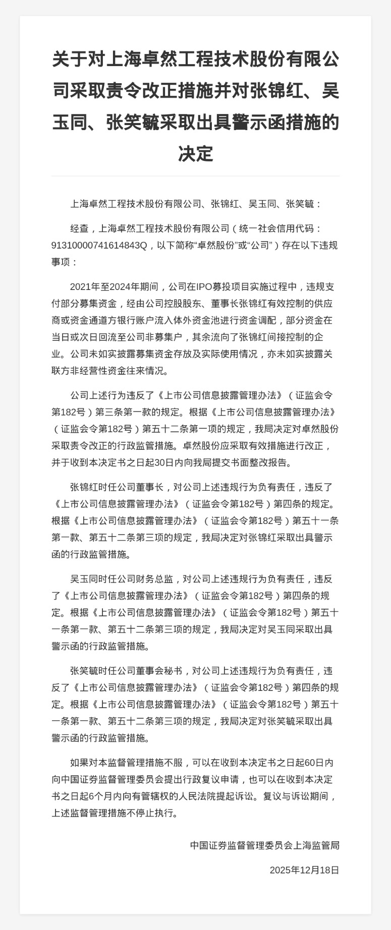 蓝鲸新闻12月25日讯,近日,中国证券监督管理委员会上海监管局发布行政监管措施决定书,剑指上海卓然工程技术股份有限公司及其相关责任人张锦红、吴玉同、张笑毓。
