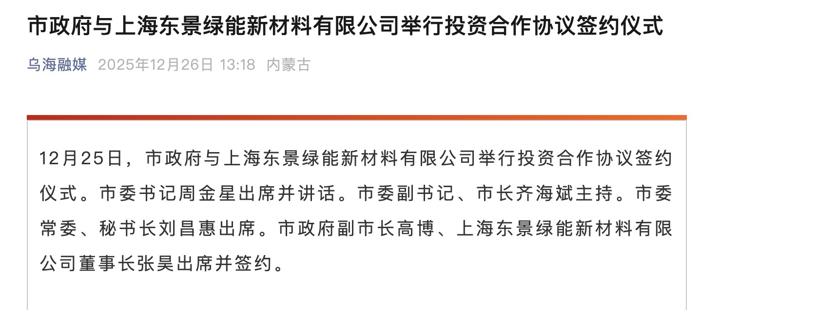 乌海市政府与上海东景绿能新材料有限公司成功签约!这不就是卓然最新公布的那笔订单么