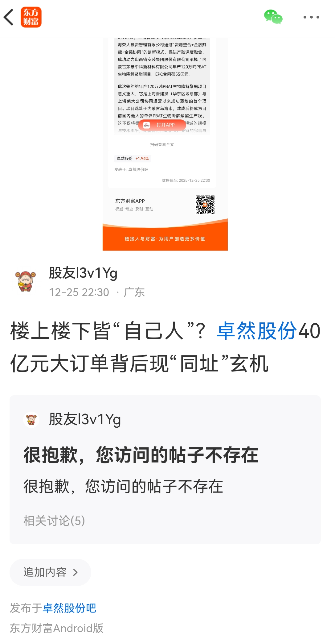 $卓然股份(SH688121)$ 楼上楼下皆“自己人”?卓然股份40亿元大订单背后现“同址”玄机。这个帖子被删除掉,呵呵,有问题。对方急了,找公关删。