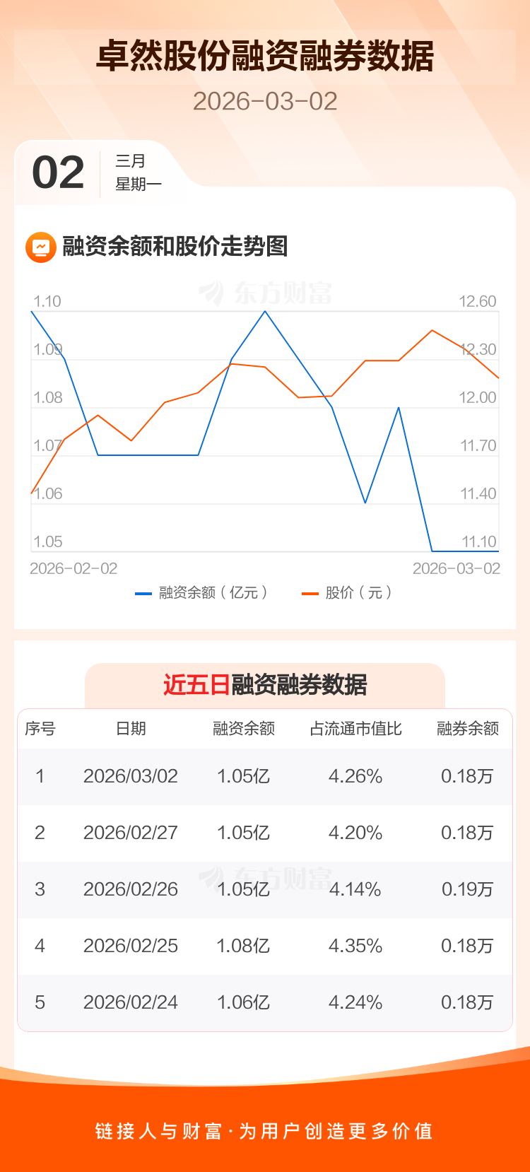 交易所最新数据显示,卓然股份于2026年3月2日获融资买入514.27万元,融资偿还510.81万元,当日融资净买入3.45万元。目前,该股融资余额1.05亿,占流通市值比例为4.26%。