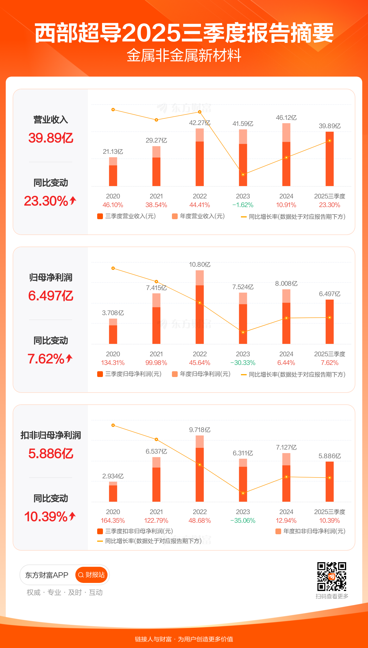 西部超导10月30日发布2025年三季报显示,公司前三季实现营业收入39.89亿元,同比增长23.30%;归母净利润6.50亿元,同比增长7.62%;扣非归母净利润5.89亿元,同比增长10.39%。