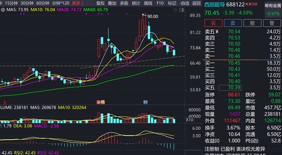 今日继续走弱,仍在下降趋势中,且缩量明显。重点观察未来几天能否在支撑线处获得有效支撑,能否开启反弹节奏。如果继续下跌,大概率就要看到65.93的位置。当前阶段以防守为主。