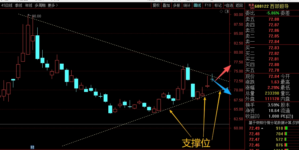 $西部超导(SH688122)$ 近期反弹趋势走得不错,整体来看主要是做一个三角收敛形态,接下来重点看形态完成后的方向选择,如果能带量突破就舒服了,可以持仓或者加仓跟随,但如果突破未遂,就要注意回落风险,特别是有效跌破脚底趋势线支撑后,需要大幅减仓应对,不用纠结。#炒股日记# #收盘点评#