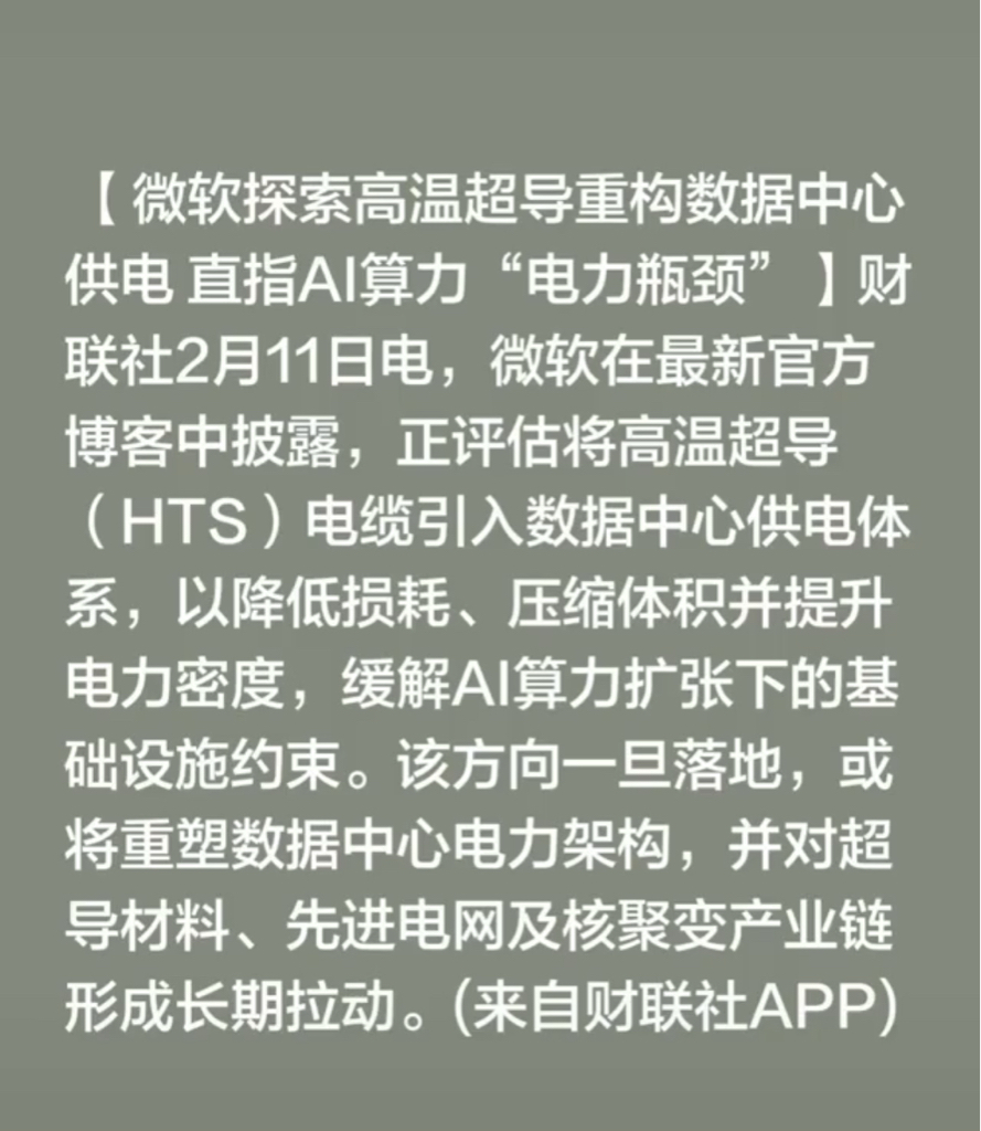 【微软正在研究高温超导技术,希望用其为数据中心输送巨量电力。超导材料具备零电阻特性,因此高温超导电缆在输电过程中既不会出现电压损耗,也不会因电流通过而发热。市场预期西部超导、精达股份有望进入审厂序列!】