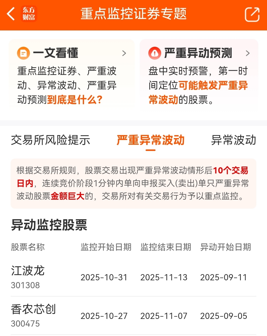 香农芯创和江波龙都因为30个交易日内涨幅超过200%被监控了,监控期分别是两周。