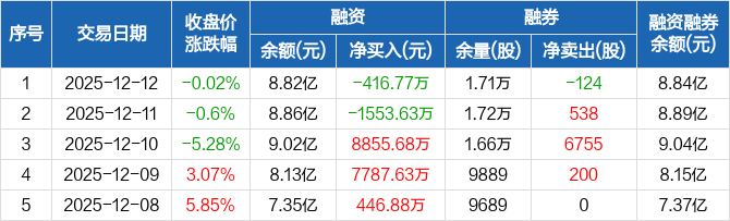 聚辰股份:融资净偿还416.77万元,融资余额8.82亿元(12-12)