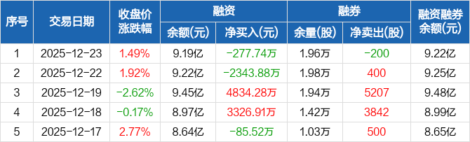 聚辰股份:融资净偿还277.74万元,融资余额9.19亿元(12-23)