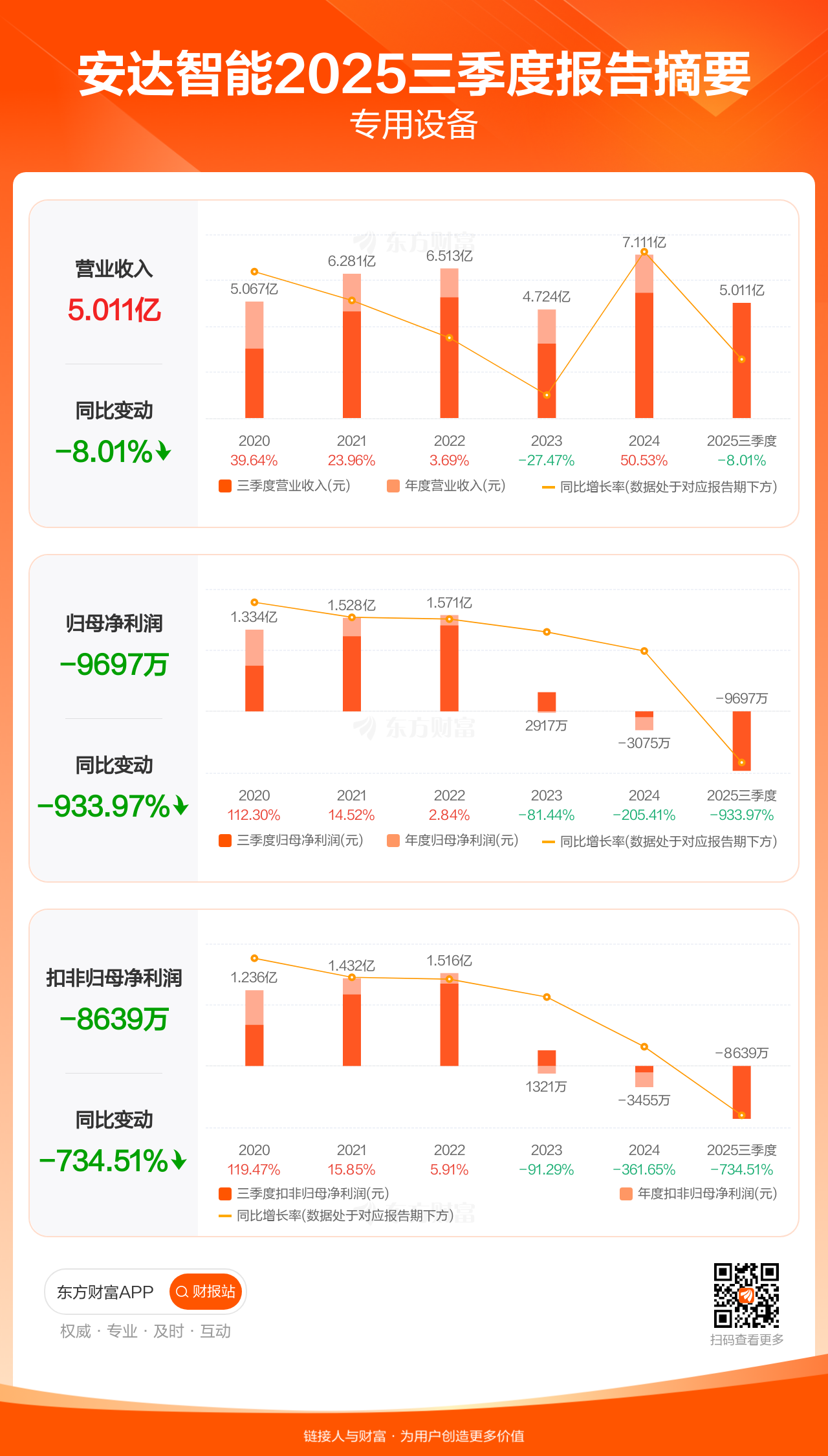 安达智能10月31日发布2025年三季报显示,公司前三季实现营业收入5.01亿元,同比下滑8.01%;归母净利润-9697.37万元;扣非归母净利润-8639.00万元。