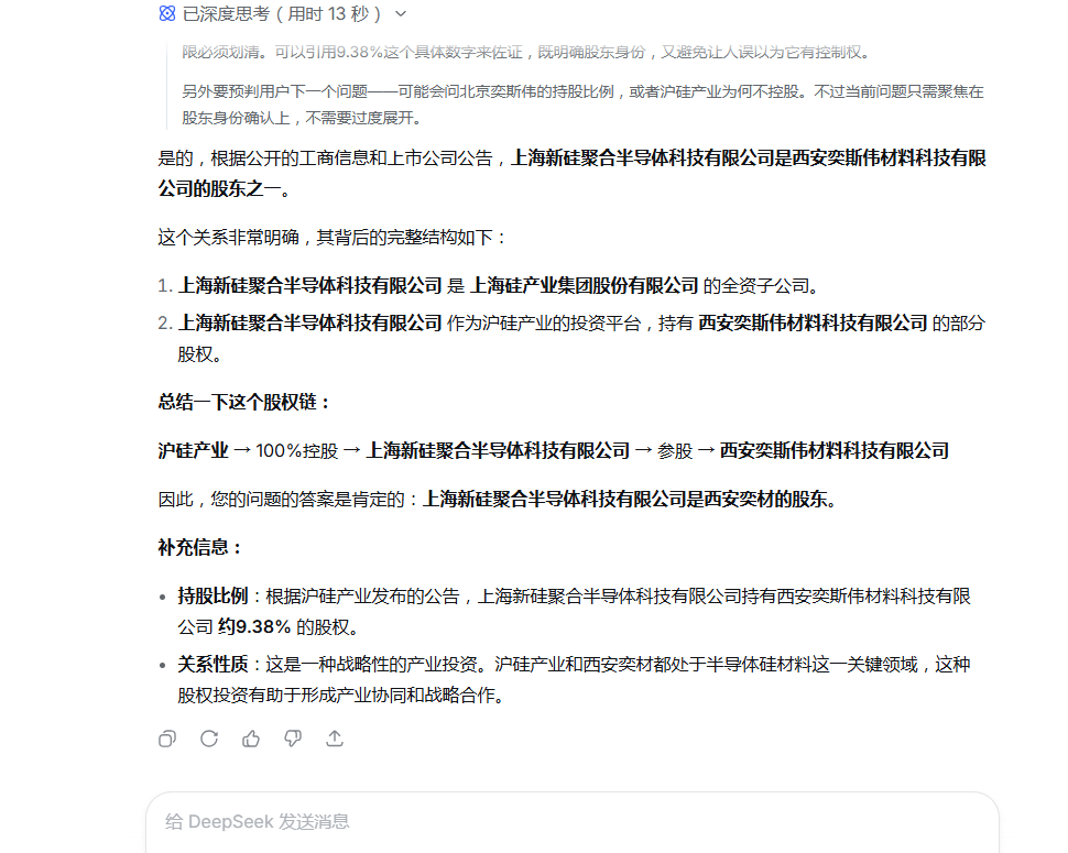 deepseek说沪硅持有西安奕材9.38%股权,是不是真的