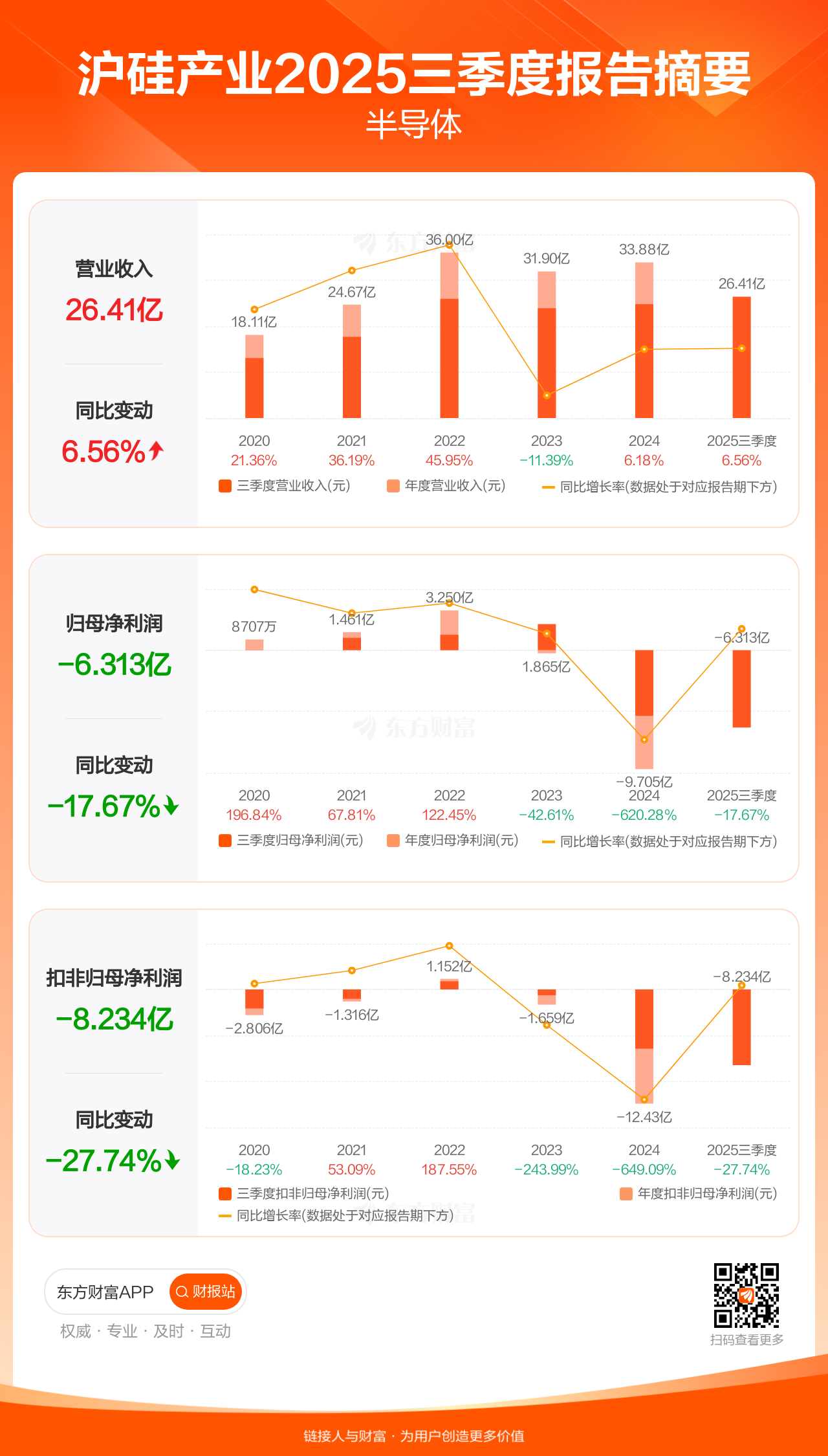沪硅产业10月31日发布2025年三季报显示,公司前三季实现营业收入26.41亿元,同比增长6.56%;归母净利润-6.31亿元;扣非归母净利润-8.23亿元。