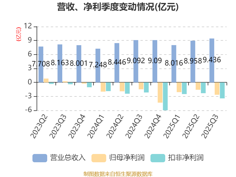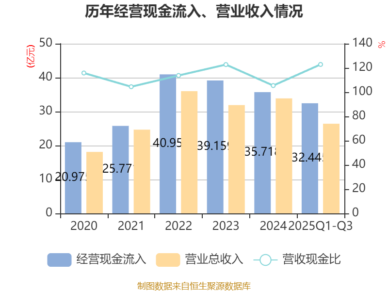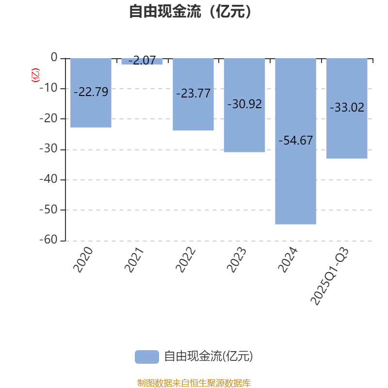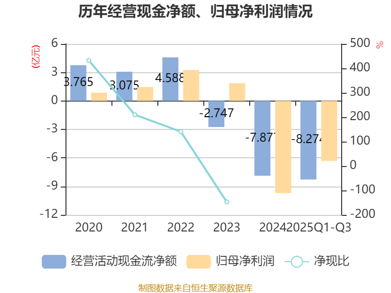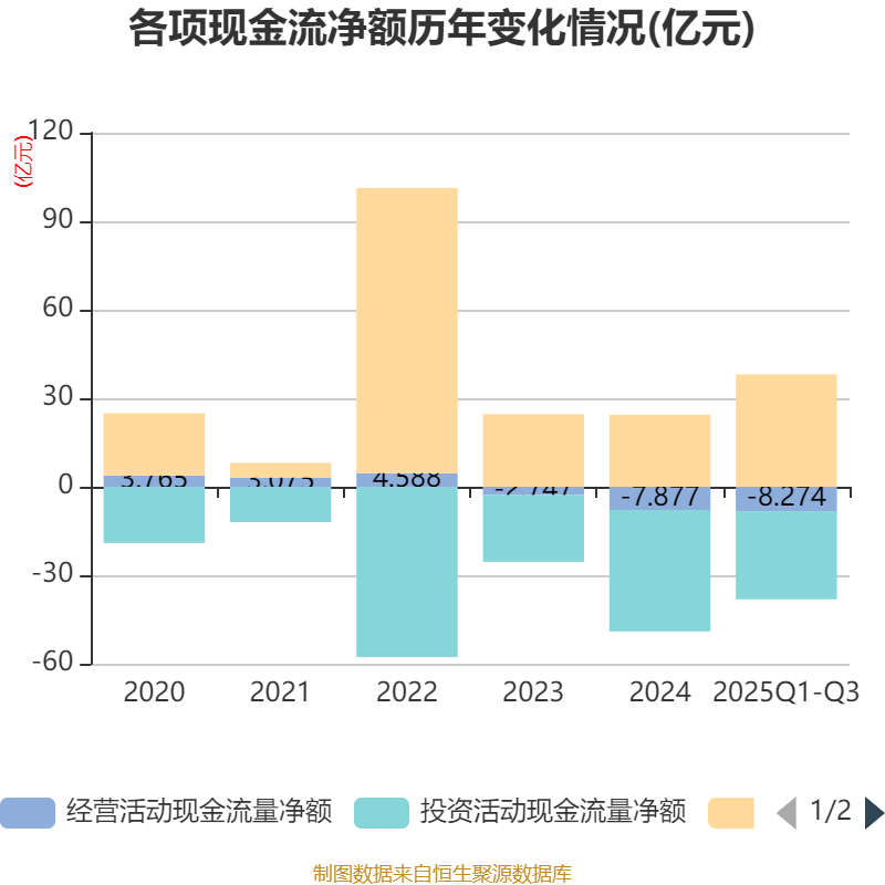 2025年前三季度,公司经营活动现金流净额为-8.27亿元,同比减少2.23亿元;筹资活动现金流净额38.11亿元,同比增加20.22亿元;投资活动现金流净额-29.87亿元,上年同期为-34.09亿元。