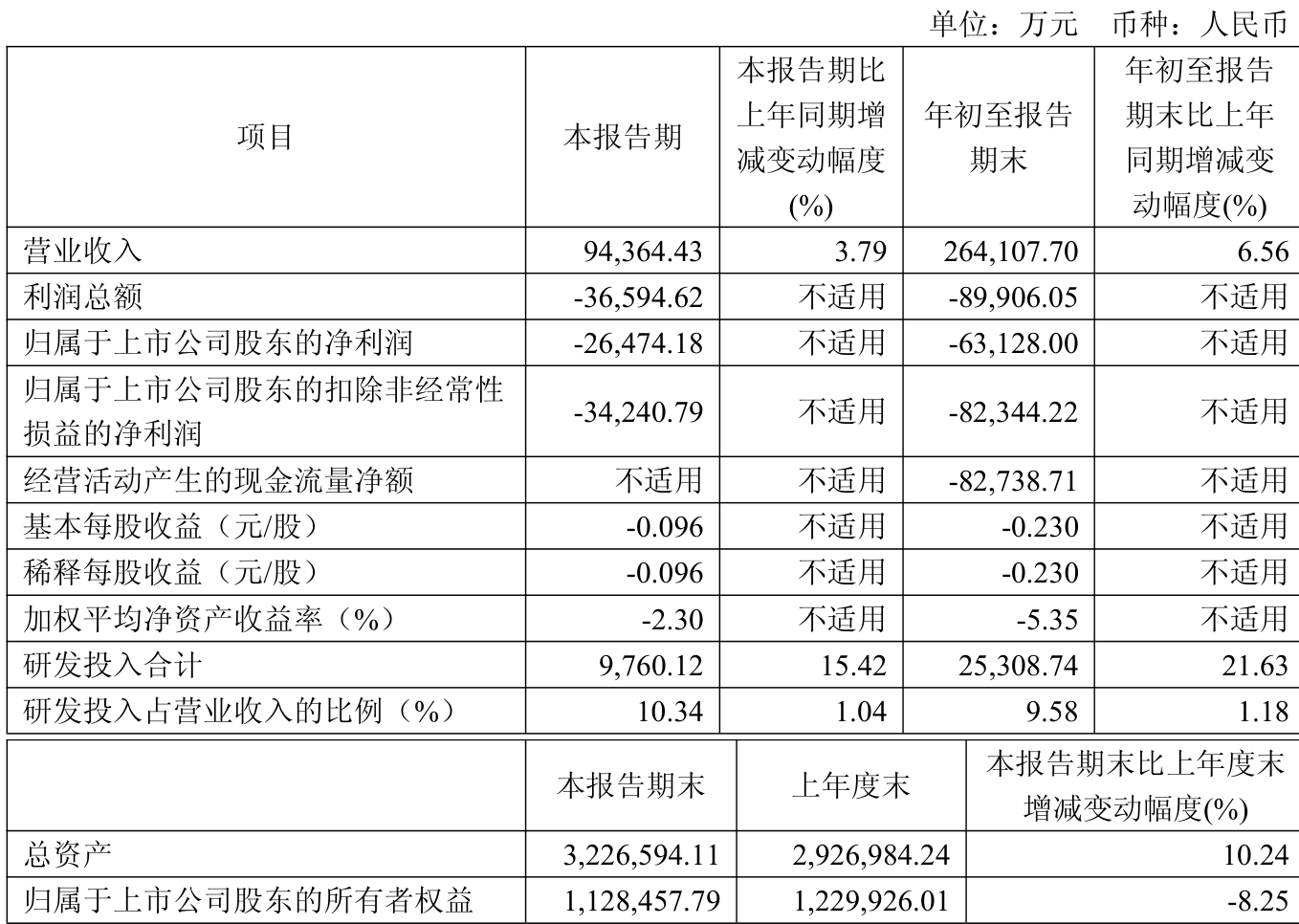 中证智能财讯沪硅产业(688126)10月31日披露2025年第三季度报告。前三季度公司实现营业总收入26.41亿元,同比增长6.56%;归母净利润亏损6.31亿元,上年同期亏损5.36亿元;扣非净利润亏损8.23亿元,上年同期亏损6.45亿元;经营活动产生的现金流量净额为-8.27亿元,上年同期为-6.04亿元;报告期内,沪硅产业基本每股收益为-0.23元,加权平均净资产收益率为-5.35%。