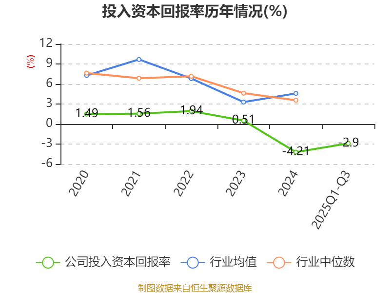 盈利能力方面, 2025年前三季度公司加权平均净资产收益率为-5.35%,同比下降1.54个百分点。公司2025年前三季度投入资本回报率为-2.9%,较上年同期下降0.34个百分点。