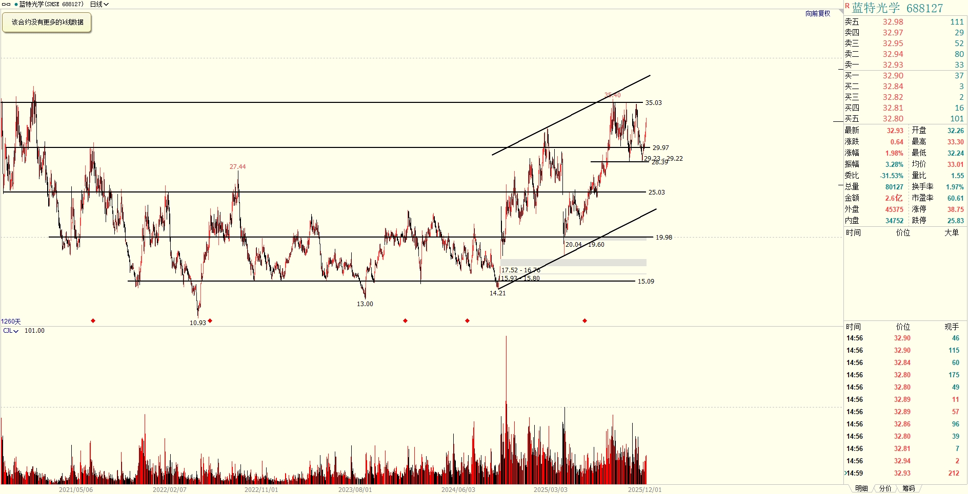 一把直尺打天下/蓝特光学15-25之间大箱体,趋势目标50;行情总体在上升通道内