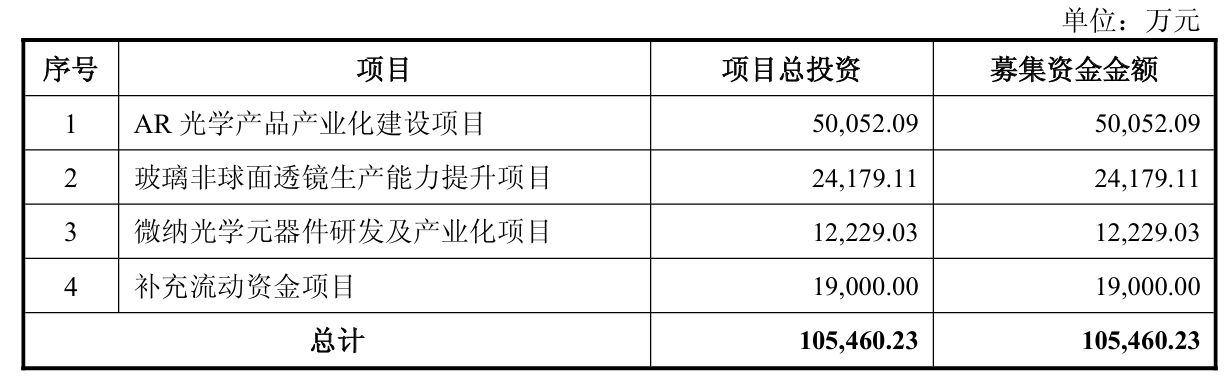 本次发行的募集资金总额不超过10.55亿元(含本数),扣除发行费用后拟用于AR光学产品产业化建设项目、玻璃非球面透镜生产能力提升项目、微纳光学元器件研发及产业化项目、补充流动资金项目。