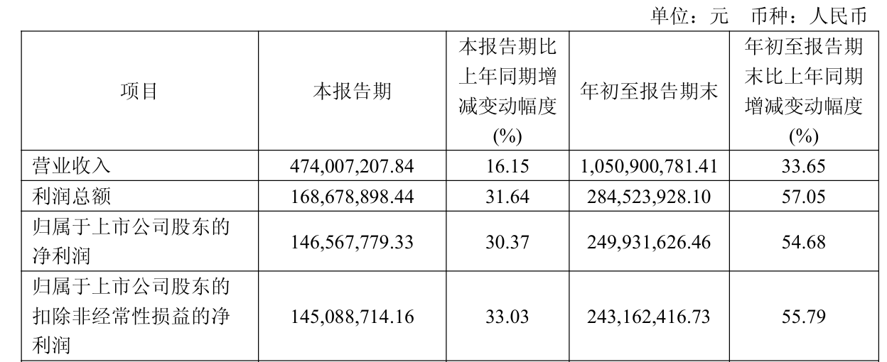 2025年前三季度,公司营业收入为10.51亿元,同比增长33.65%;归母净利润为2.50亿元,同比增长54.68%;扣非归母净利润为2.43亿元,同比增长55.79%。