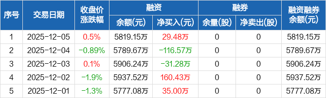 东来技术:融资净买入29.48万元,融资余额5819.15万元(12-05)