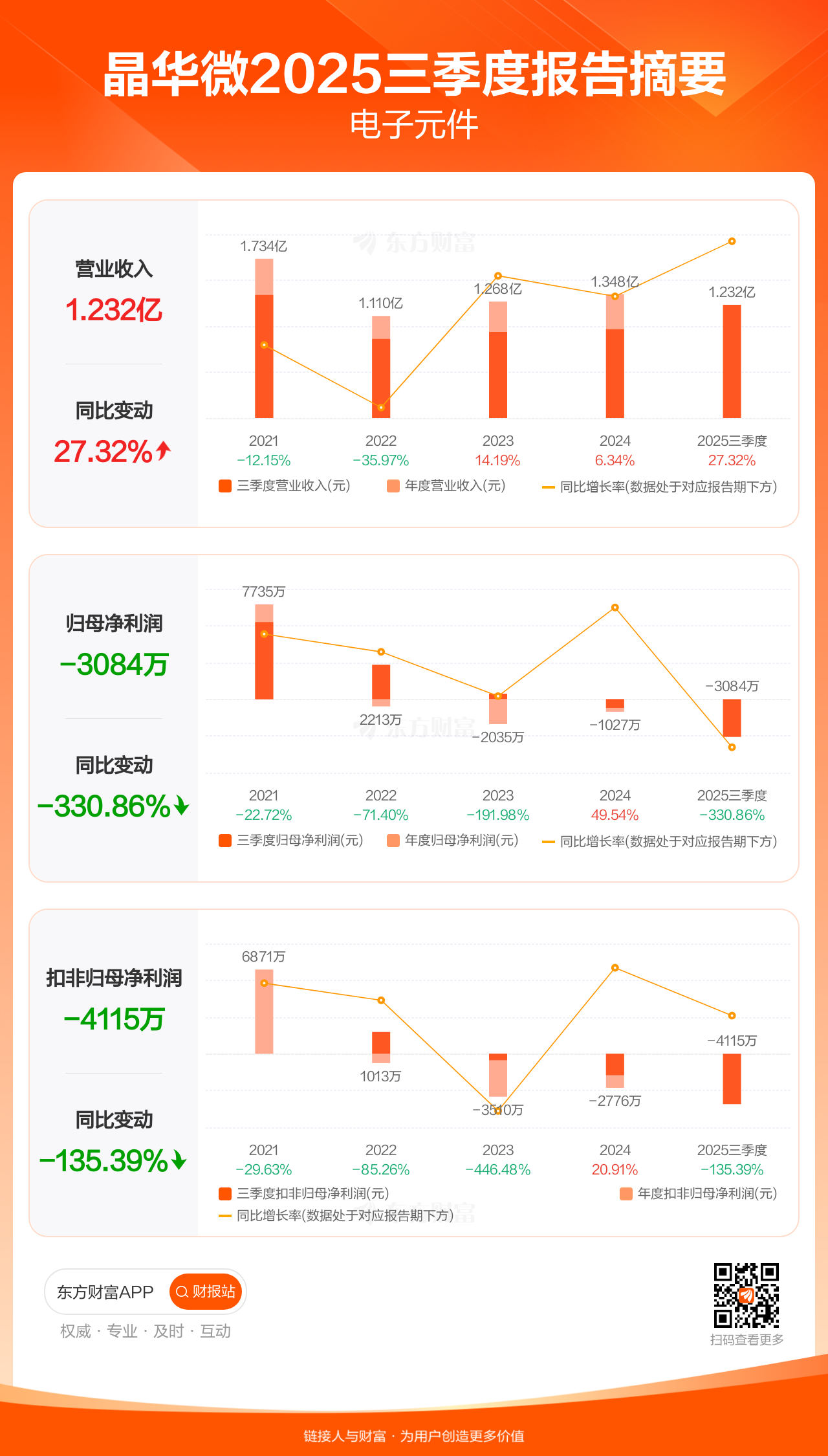 晶华微10月31日发布2025年三季报显示,公司前三季实现营业收入1.23亿元,同比增长27.32%;归母净利润-3084.07万元;扣非归母净利润-4114.77万元。